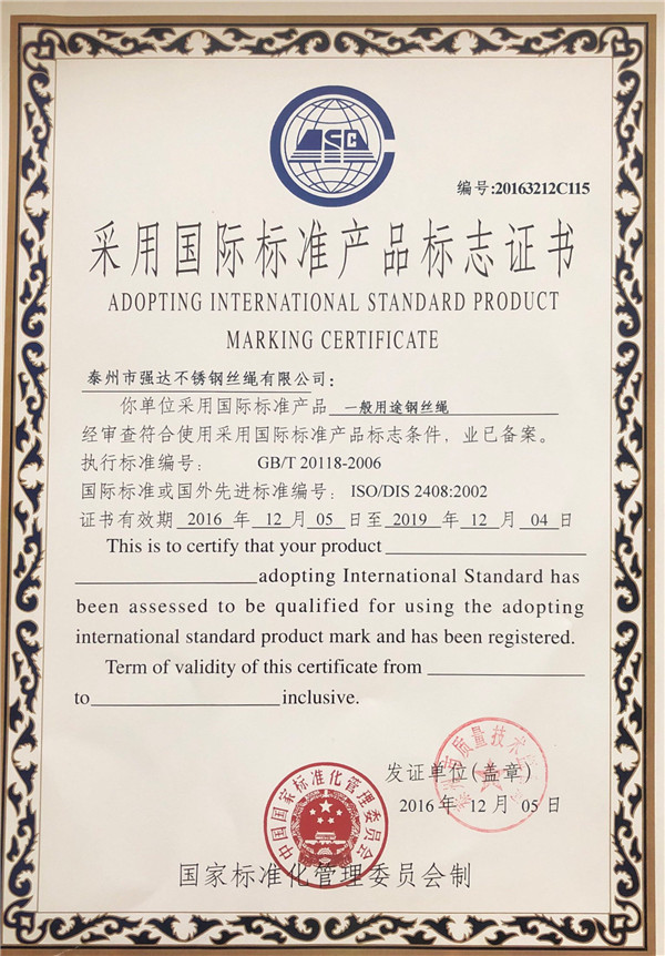 泰州市強達不銹鋼絲繩有限公司位于江蘇興化市戴南經(jīng)濟開發(fā)區(qū),公司致力于不銹鋼絲繩產(chǎn)品生產(chǎn),立志成為“國內(nèi)技術(shù)標桿型吊索具生產(chǎn)企業(yè)”。以此戰(zhàn)略思想指導(dǎo),公司堅決貫徹“質(zhì)量贏市場,管理增效益,誠信贏天下”的質(zhì)量方針。以完善的服務(wù)在國內(nèi)不銹鋼絲繩市場樹立良好的品牌形象。公司榮獲“江蘇省質(zhì)量信得過企業(yè)。     靈活的管理機制,經(jīng)驗豐富的